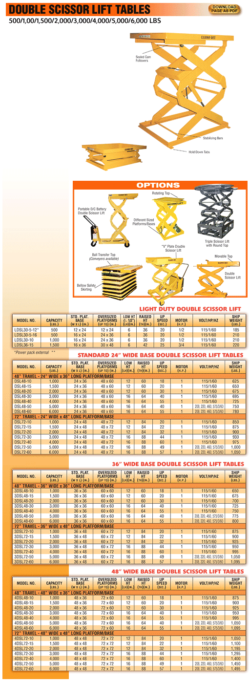 24 wide x 36 long to 72 wide x 72 long base sizes Standard 24,36,48 wide x 36,48 long travel 48, 72 vertical travel lowered heights 12, 18 safety Velocity fuse is standard on each cylinder Heavy duty hydraulic cylinders - chrome plated rod with polyurethane seals Power supplies A/C 110/1/60 volt (standard) Hand or foot operated A/C 460/575/3/60 volt (opt.) Hand or foot operated Air/Hydraulic Foot operated (standard) Hand operated (optional) Internally mounted Easily accessible for maintenance or repair Motors - Single phase 1 h.p. and three phase 1-1/2 h.p. - hand or foot operated standard Maintenance Hinged table top provides easy access to power unit and cylinders Self lubricated bronze bushings on all wear points options Oversized platforms Beveled edges for pit mounting Eye-bolts for pit mounting Rotating tops - spring detents - manual detents Roller conveyor, Ball transfer tops Bellow safety skirting Safety tape switch Semi-portable Portable ![]() |